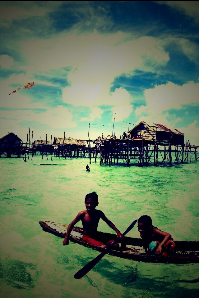 «Дети в лодке у поселения туземцев»