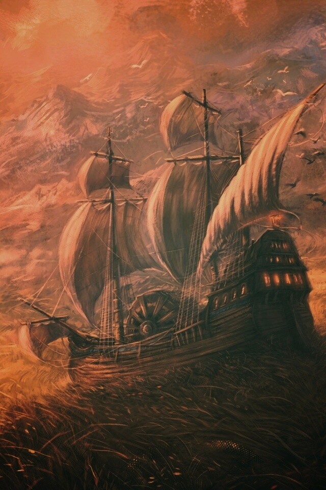 Обои для рабочего стола «Корабль в море травы» 640х960 с фильтром earlybird (оригинал 2993х1351)