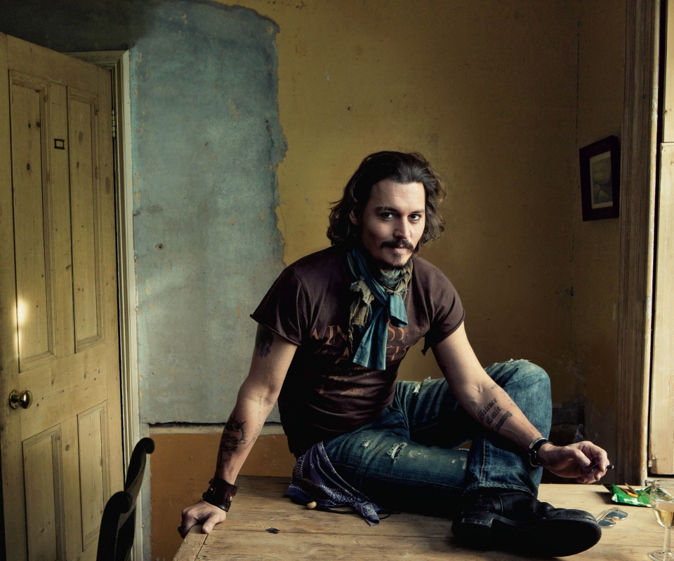 Обои для рабочего стола «Джонни Депп на столе» 960х800 (оригинал 4800х3263)
