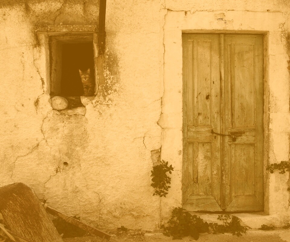 «Кот выглядывает из разрушенного дома»
