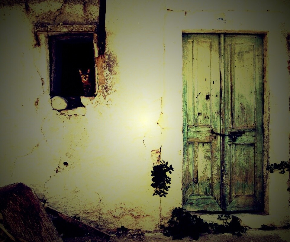 «Кот выглядывает из разрушенного дома»