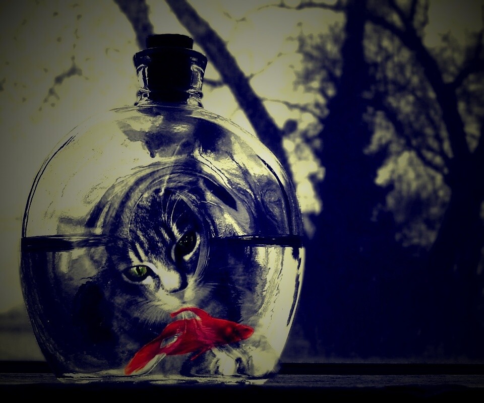 «Кот наблюдает за рыбкой в бутылке»