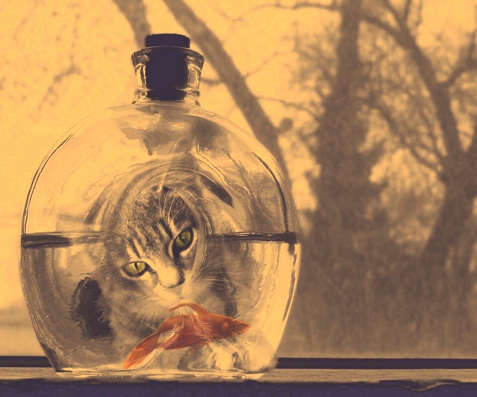 «Кот наблюдает за рыбкой в бутылке»
