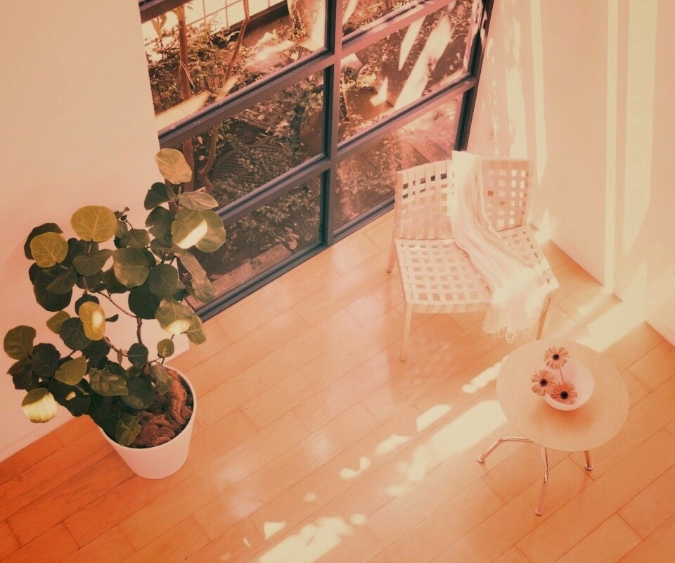 «Стул, столик и цветы в комнате»
