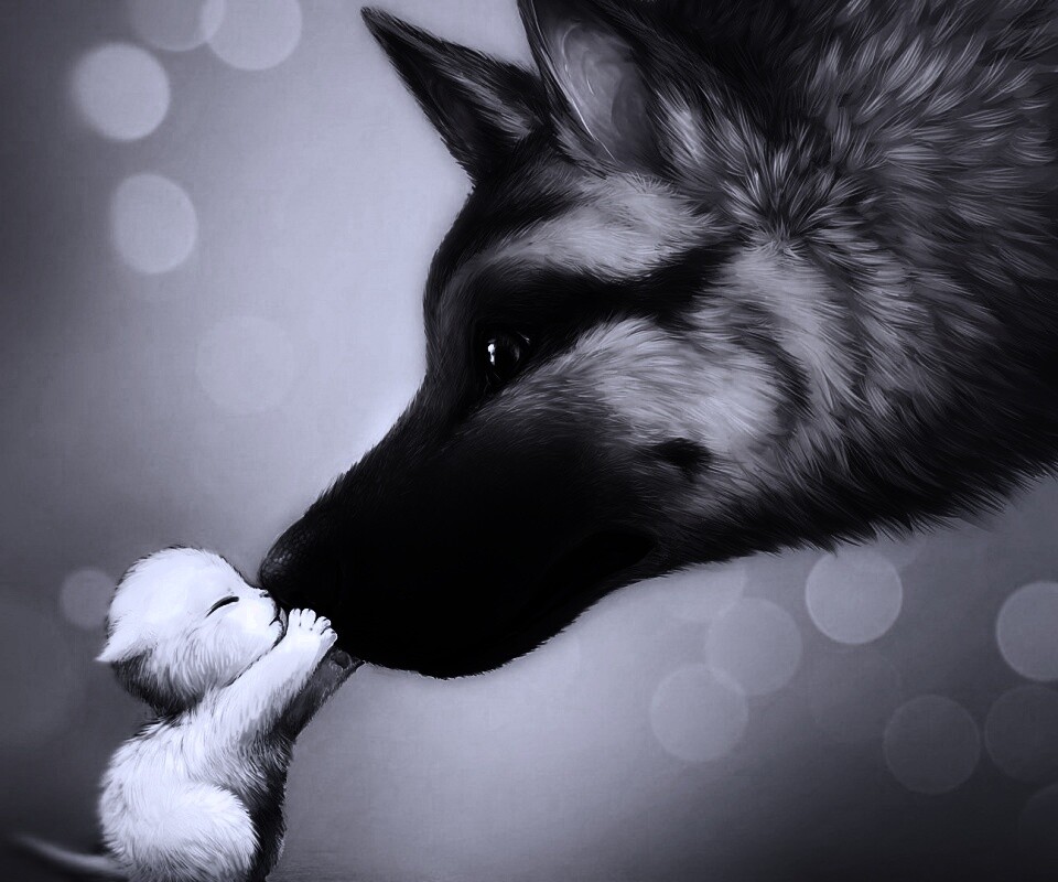 Обои для рабочего стола «Овчарка и котенок» 960х800 с фильтром gotham (оригинал 1920х1080)