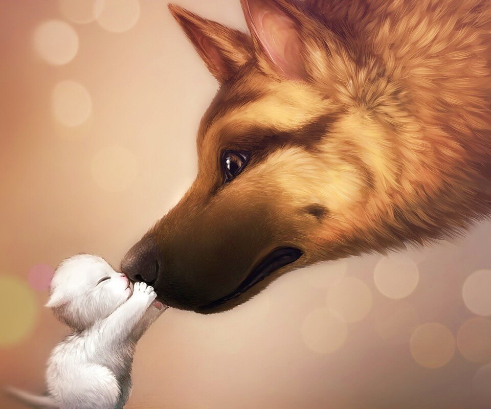 Обои для рабочего стола «Овчарка и котенок» 960х800 с фильтром vibrance (оригинал 1920х1080)