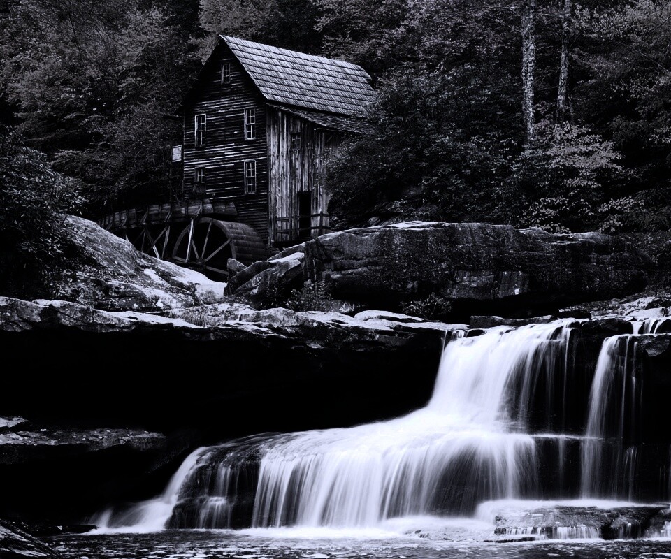 Обои для рабочего стола «Дом, водяное колесо и водопад» 960х800 с фильтром gotham (оригинал 1920х1080)