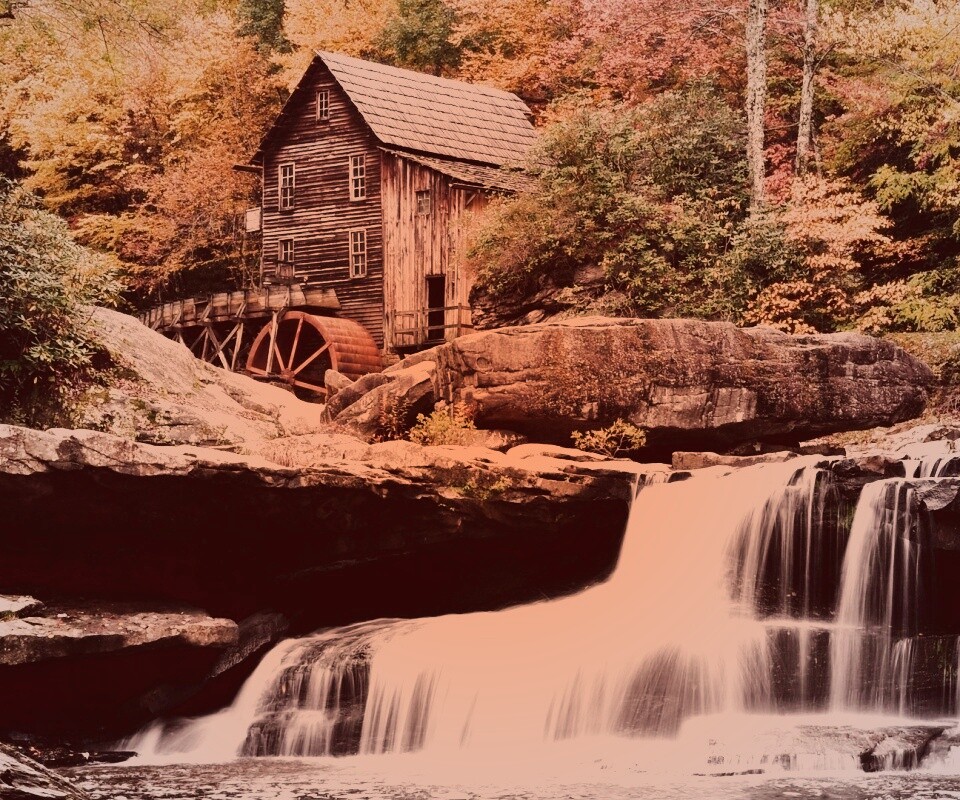Обои для рабочего стола «Дом, водяное колесо и водопад» 960х800 с фильтром toaster (оригинал 1920х1080)