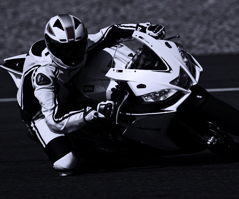 Обои для рабочего стола «Байкер в белой экиперовкена Априлия РСВ4» 960х800 с фильтром gotham (оригинал 3200х2000)