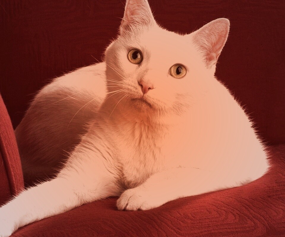 Обои для рабочего стола «Белой кот на красном диване» 960х800 с фильтром toaster (оригинал 1680х1050)