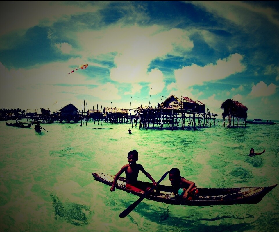 «Дети в лодке у поселения туземцев»