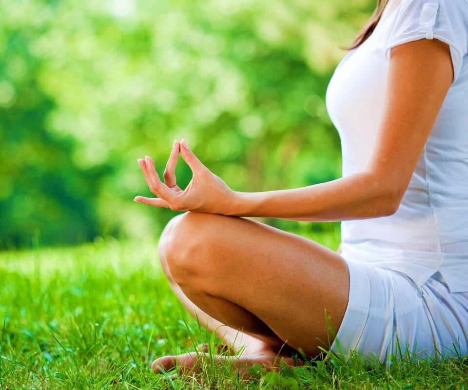 «Девушка медитирует в позе лотоса на траве»