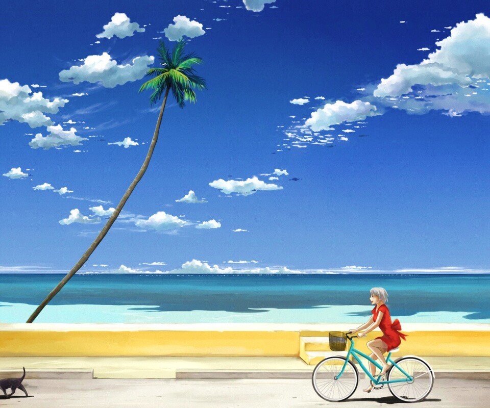 «Девушка едет на велосипеде вдоль берега»