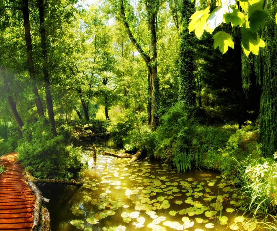 Обои для рабочего стола «Пруд в лесу» 960х800 с фильтром vibrance (оригинал 1920х1200)