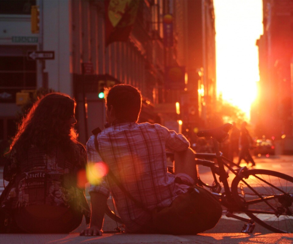 «Девушка и парень с велосипедом на закате»