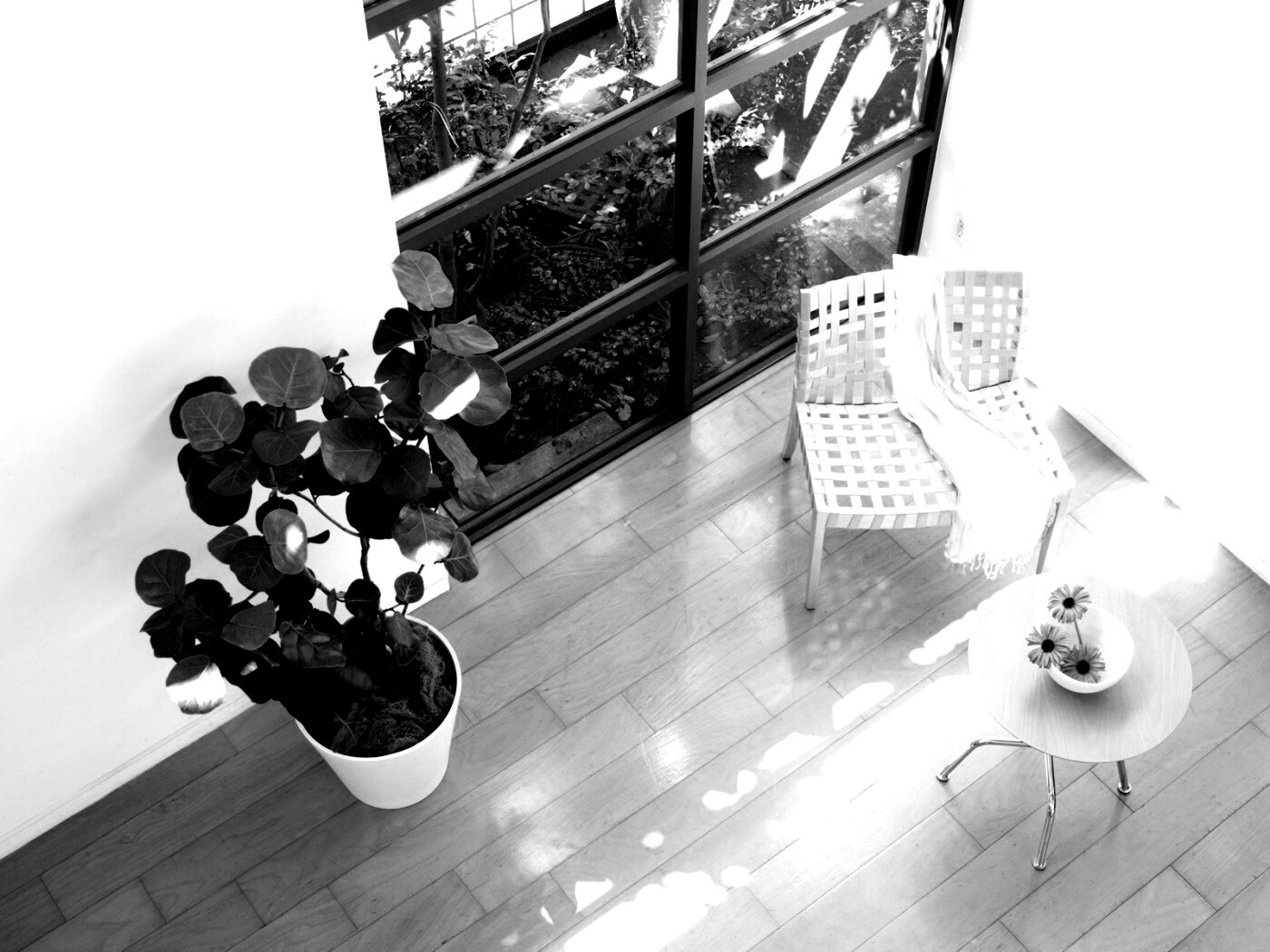 «Стул, столик и цветы в комнате»