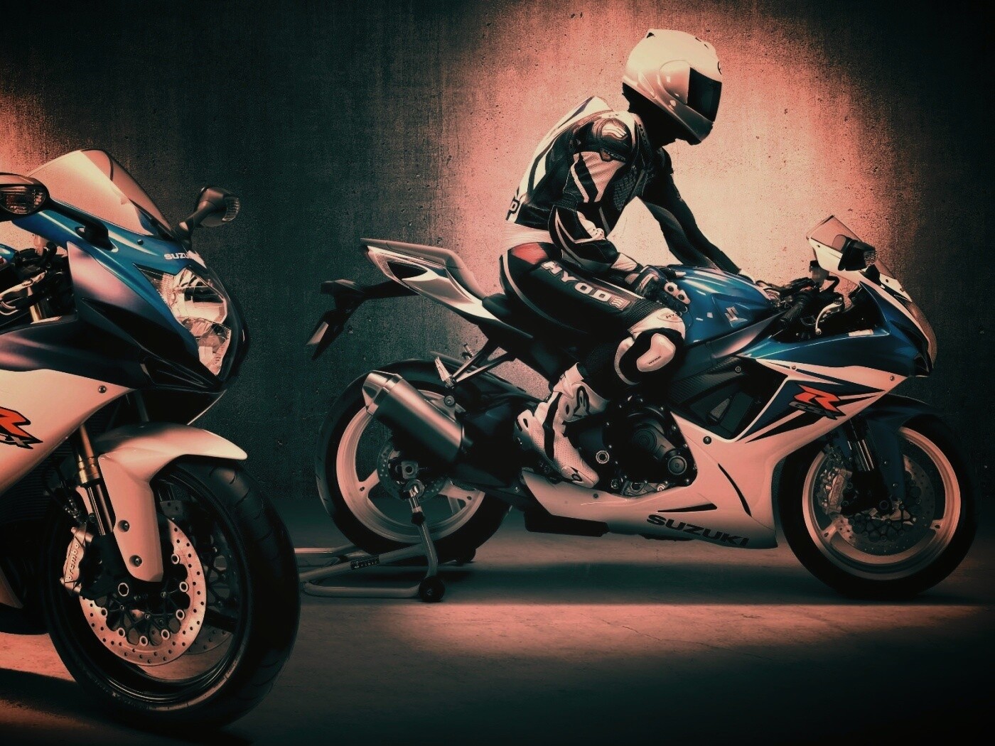 Обои для рабочего стола «Suzuki и мотоциклист» 1400х1050 с фильтром earlybird (оригинал 1920х1200)