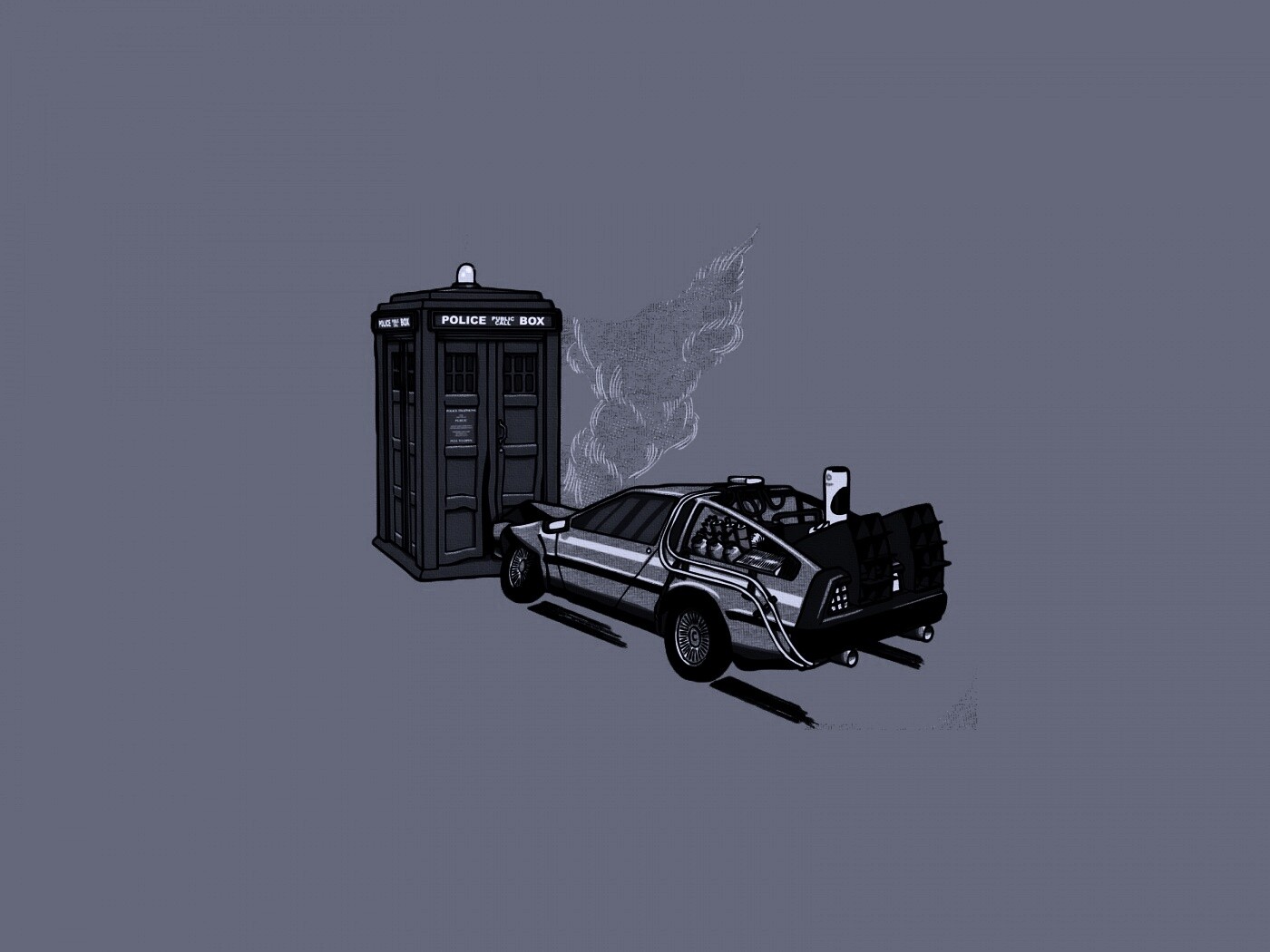 Обои для рабочего стола «Что будет если ДеЛореан врежется в Тардис?» 1400х1050 с фильтром gotham (оригинал 1920х1200)