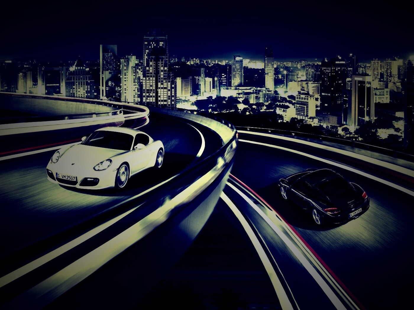 «Черный и белый Porsche на автомагистрале.»