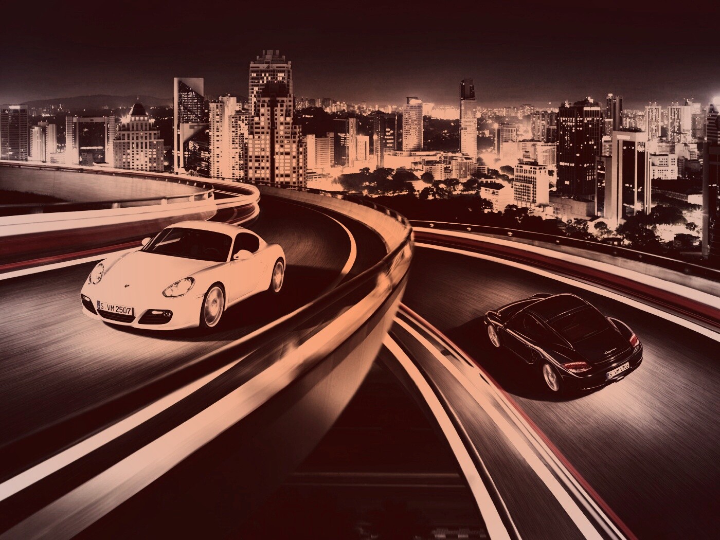 «Черный и белый Porsche на автомагистрале.»