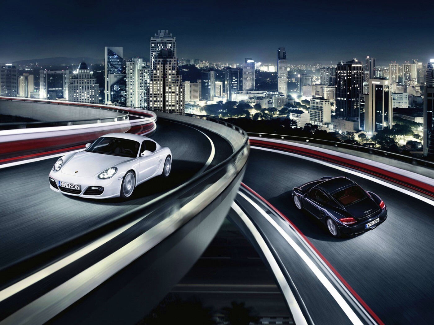 «Черный и белый Porsche на автомагистрале.»