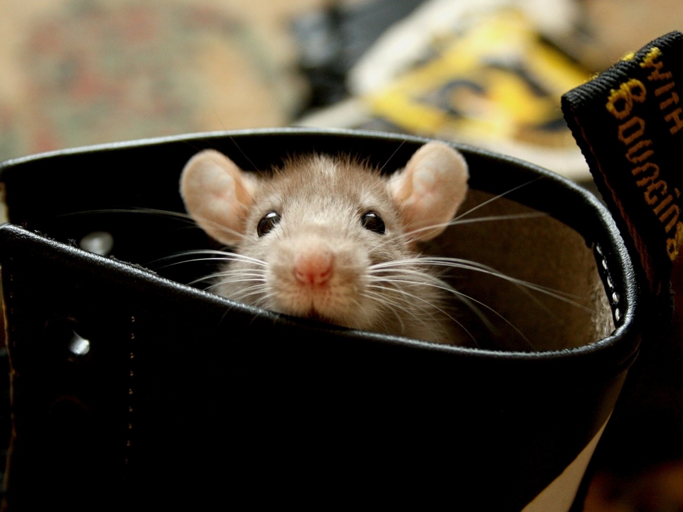 Обои для рабочего стола «Мышонок выглядывает из ботинка» 1400х1050 (оригинал 1920х1176)