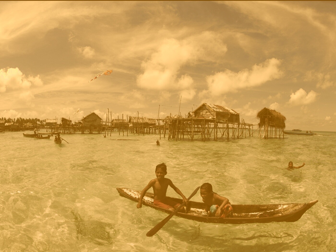 «Дети в лодке у поселения туземцев»