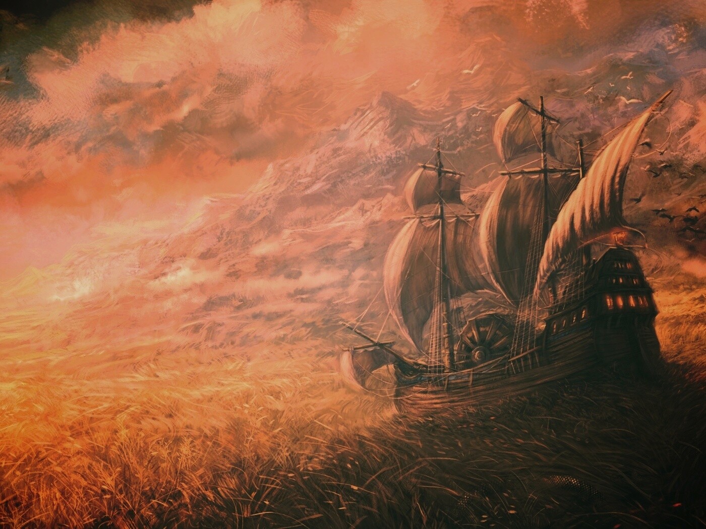 Обои для рабочего стола «Корабль в море травы» 1400х1050 с фильтром earlybird (оригинал 2993х1351)