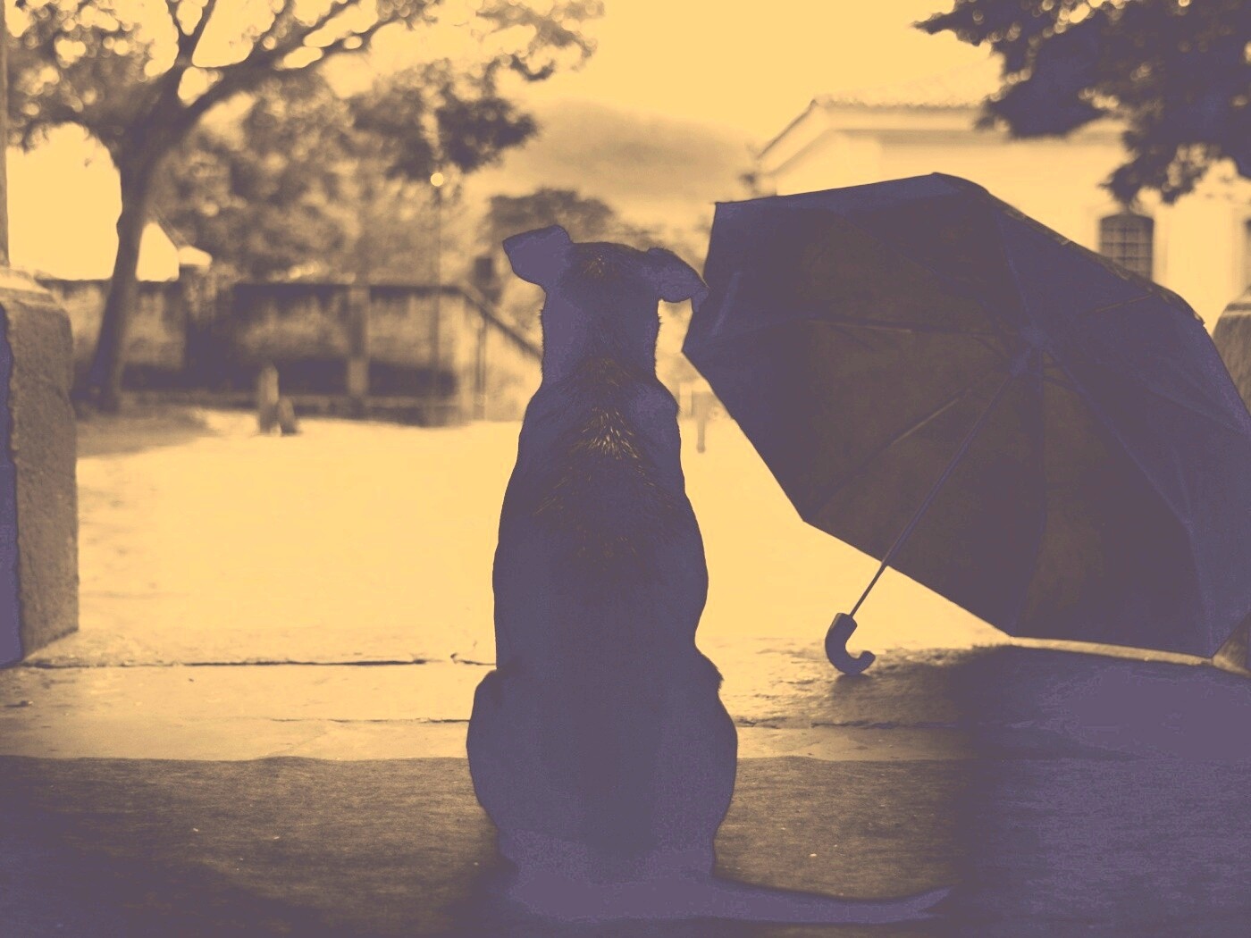 Обои для рабочего стола «Собака и зонтик» 1400х1050 с фильтром nashville (оригинал 2560х1600)