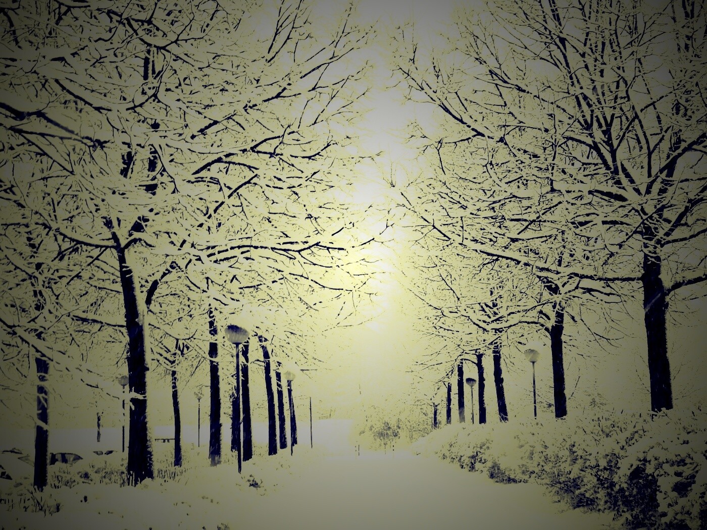 Обои для рабочего стола «Заснеженная аллея» 1400х1050 с фильтром lomo (оригинал 2704х1764)