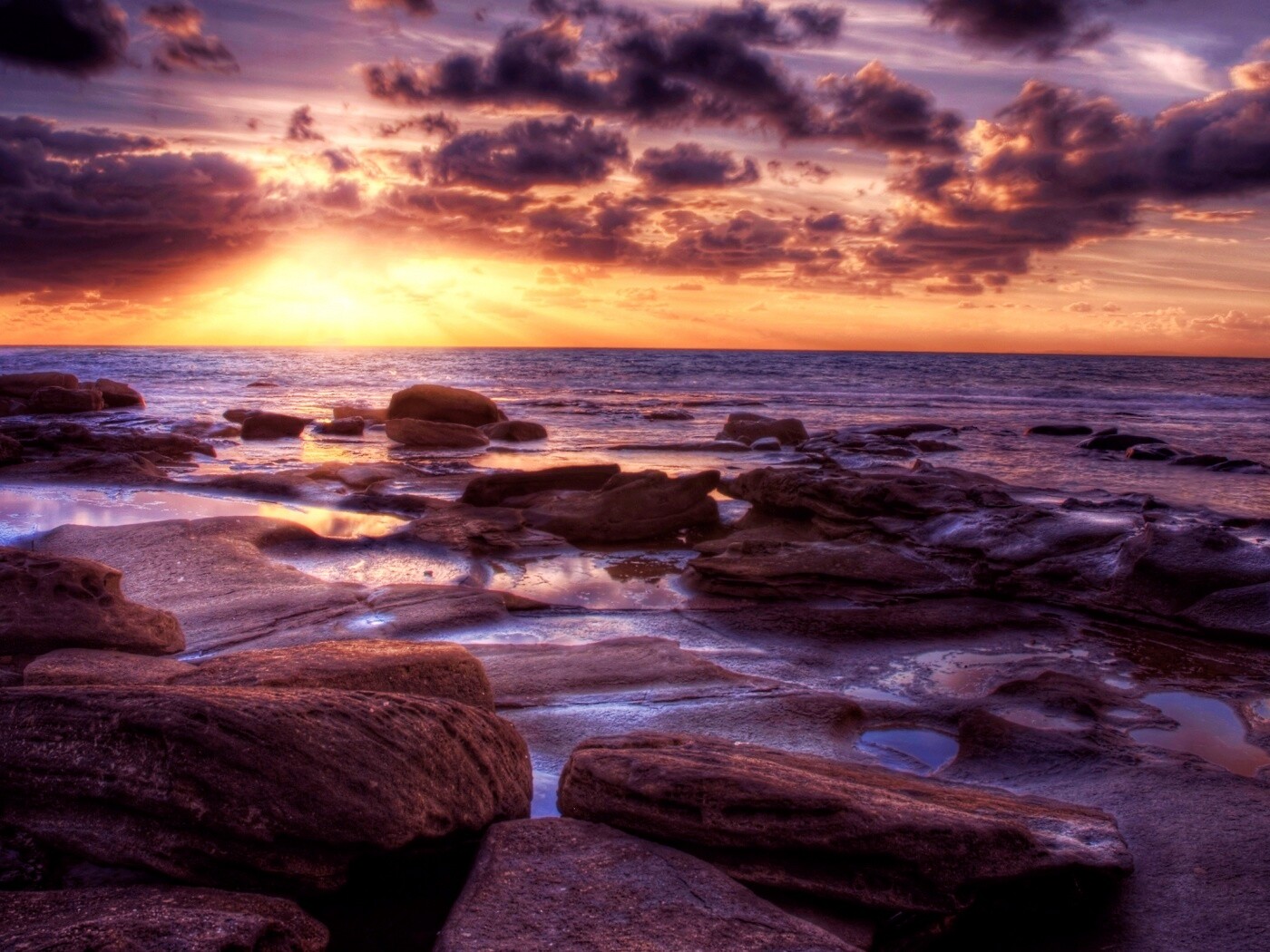 Обои для рабочего стола «Каменистый берег на закате» 1400х1050 с фильтром vibrance (оригинал 2560х1600)