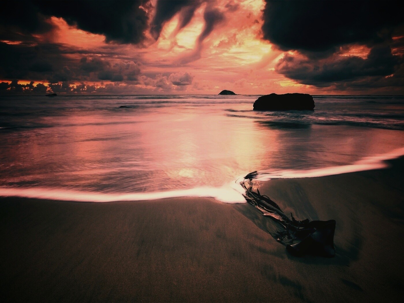 Обои для рабочего стола «Коряга на пляже» 1400х1050 с фильтром earlybird (оригинал 2560х1600)