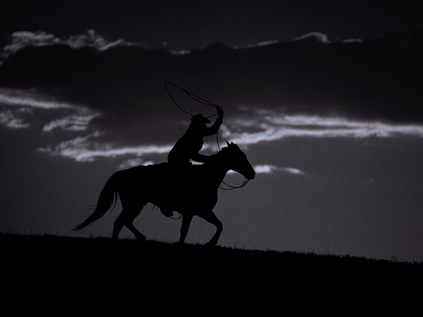 Обои для рабочего стола «Силуэт ковбоя на закате» 1400х1050 с фильтром gotham (оригинал 1920х1200)