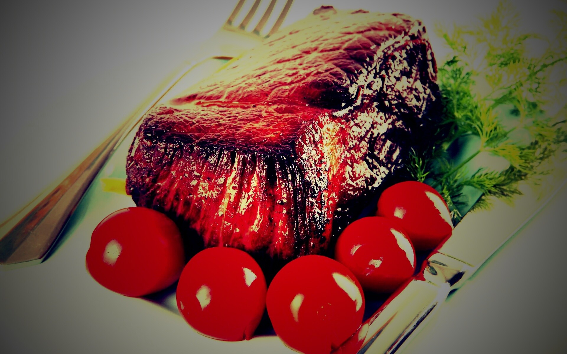 Обои для рабочего стола «Стейк с помидорами» 1920х1200 с фильтром lomo (оригинал 2560х1600)