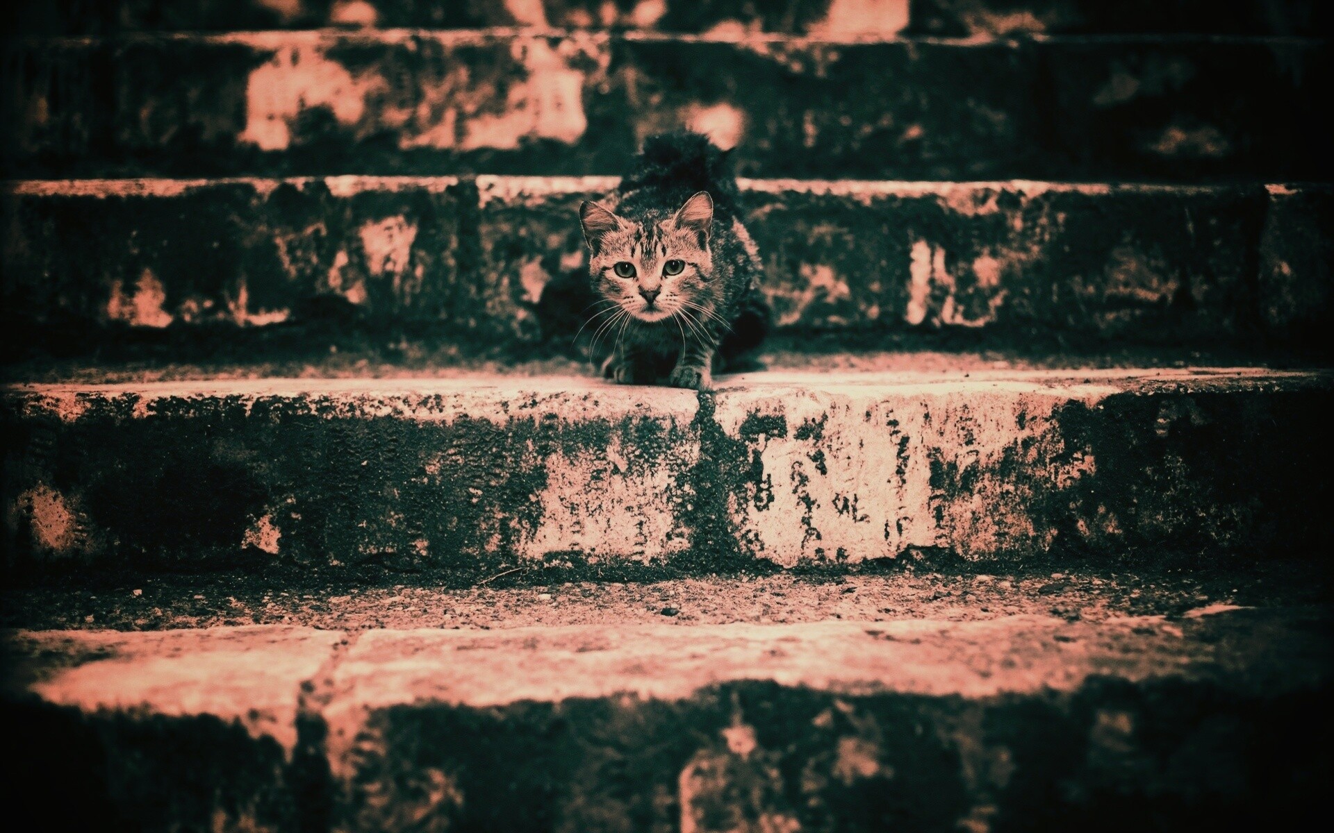 «Растрепанная кошка на ступеньках лестницы»