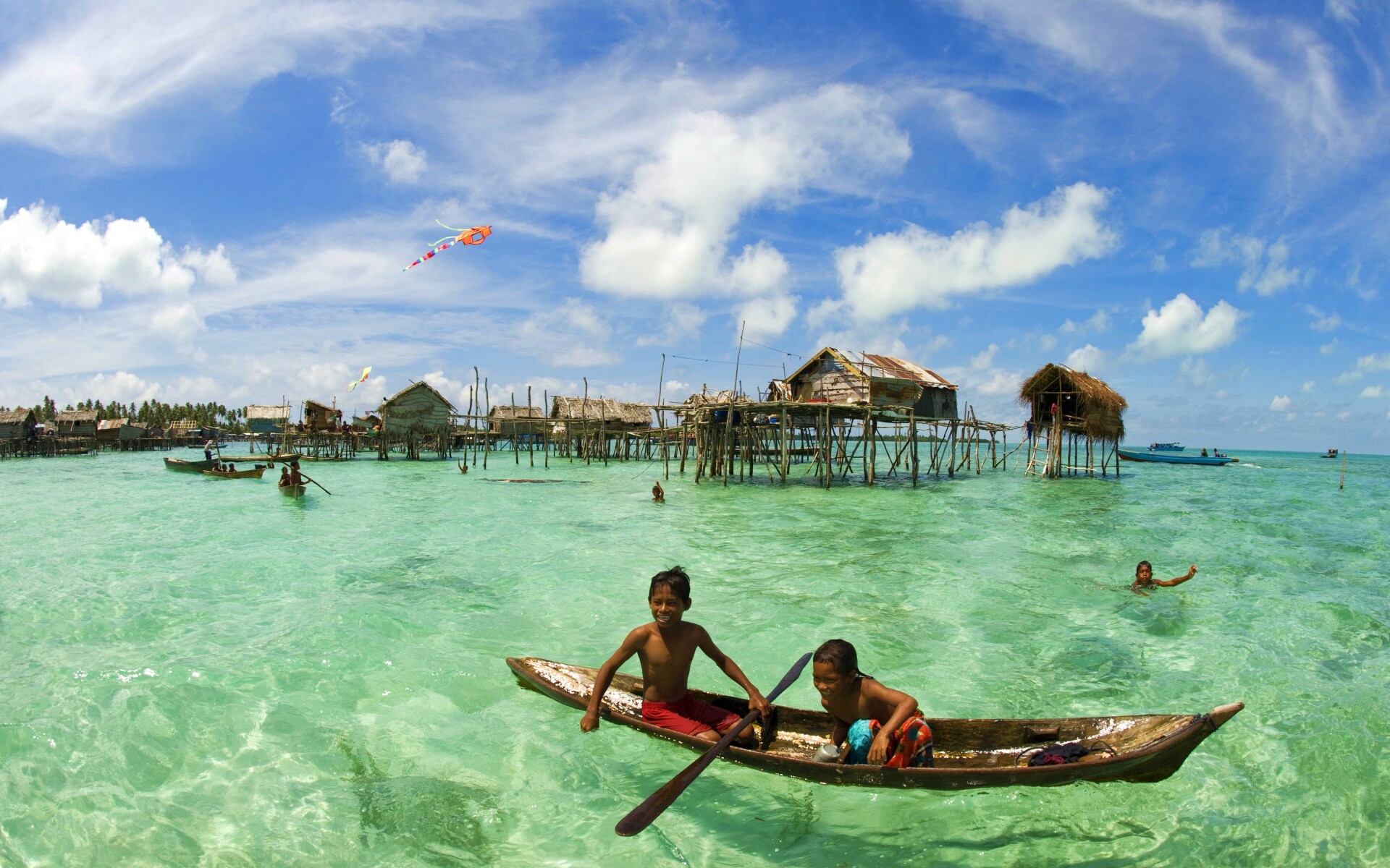 «Дети в лодке у поселения туземцев»