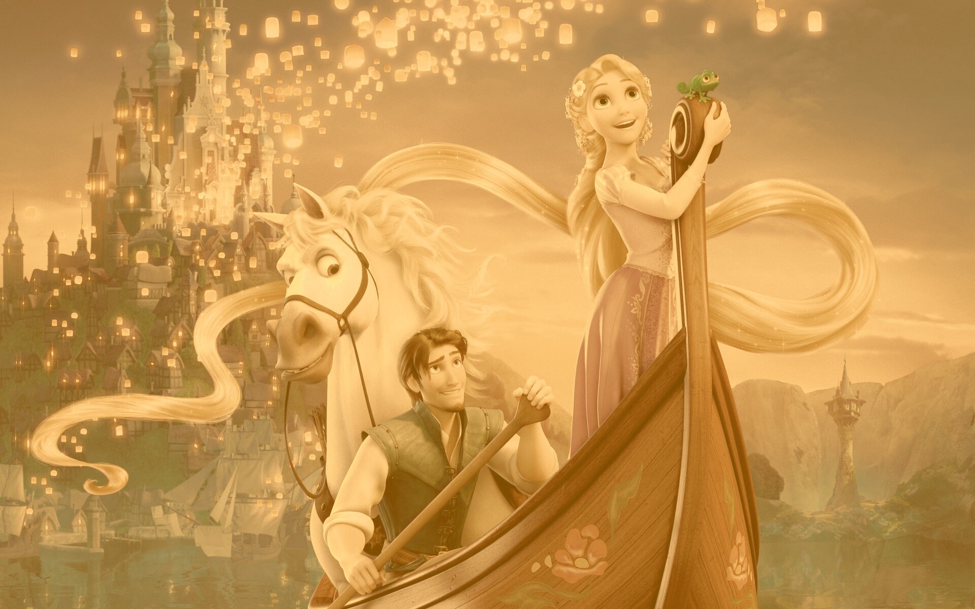 Обои для рабочего стола «Рапунцель принц и конь в лодке» 1920х1200 с фильтром kelvin (оригинал 3861х3729)