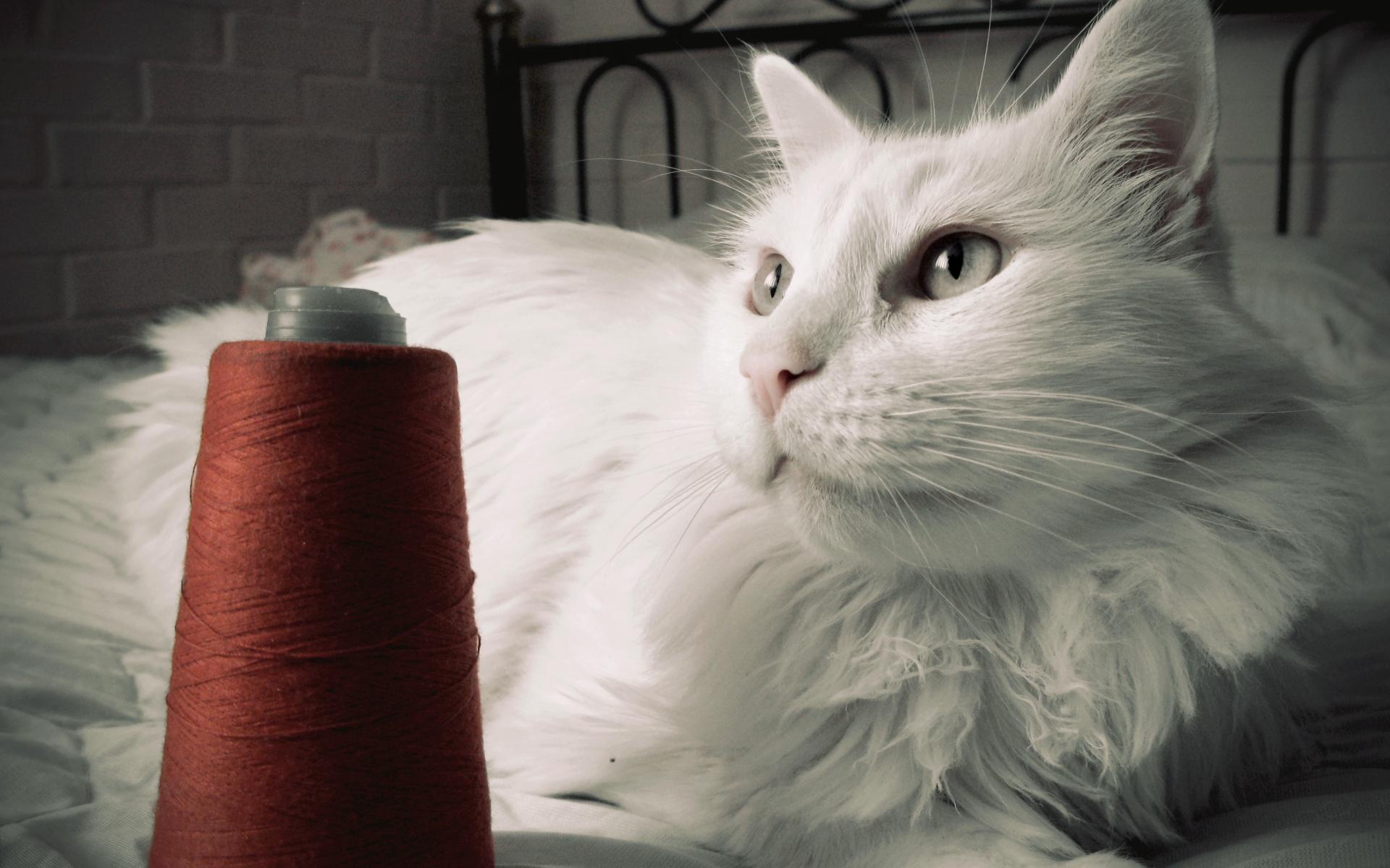 Обои для рабочего стола «Белый кот с катушкой ниток» 1920х1200 (оригинал 3648х2736)