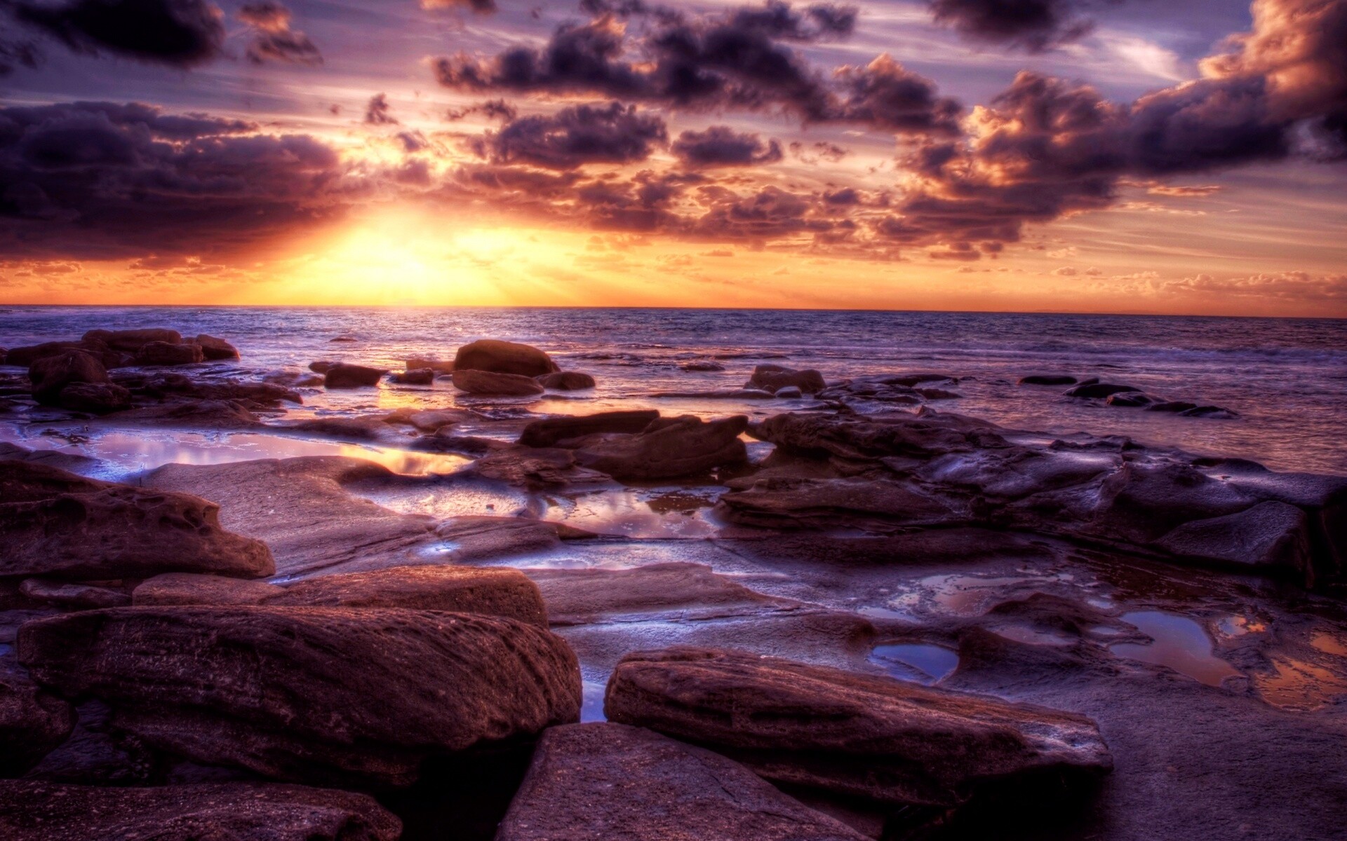 Обои для рабочего стола «Каменистый берег на закате» 1920х1200 с фильтром vibrance (оригинал 2560х1600)