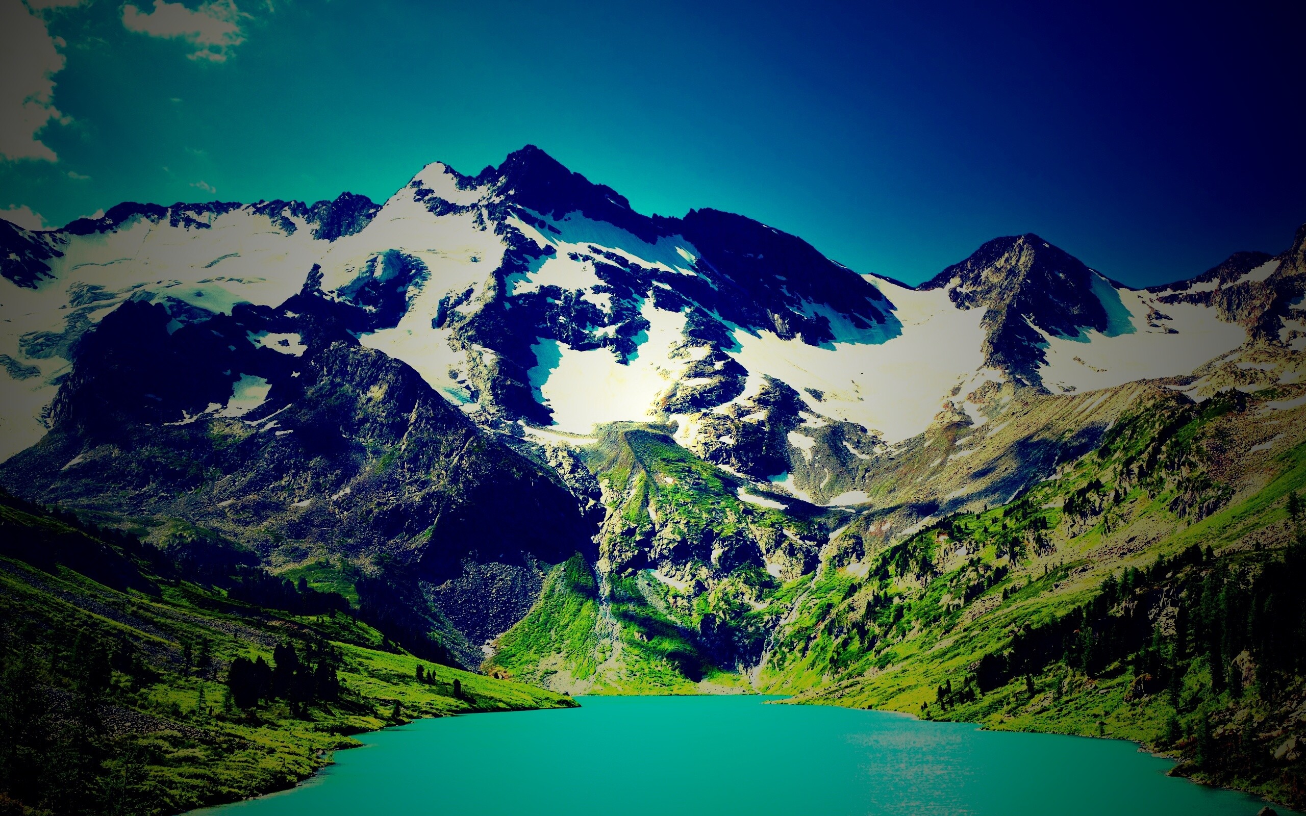 Обои для рабочего стола «Горное озеро» 2560х1600 с фильтром lomo (оригинал 2560х1600)