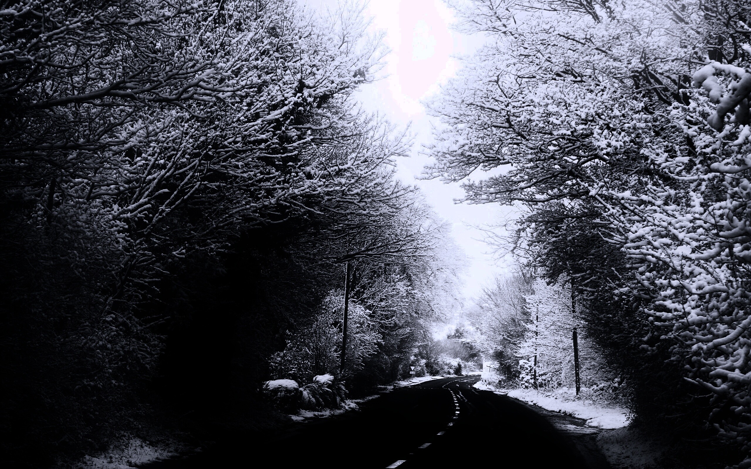 Обои для рабочего стола «Дорога через зимний лес» 2560х1600 с фильтром gotham (оригинал 2560х1600)