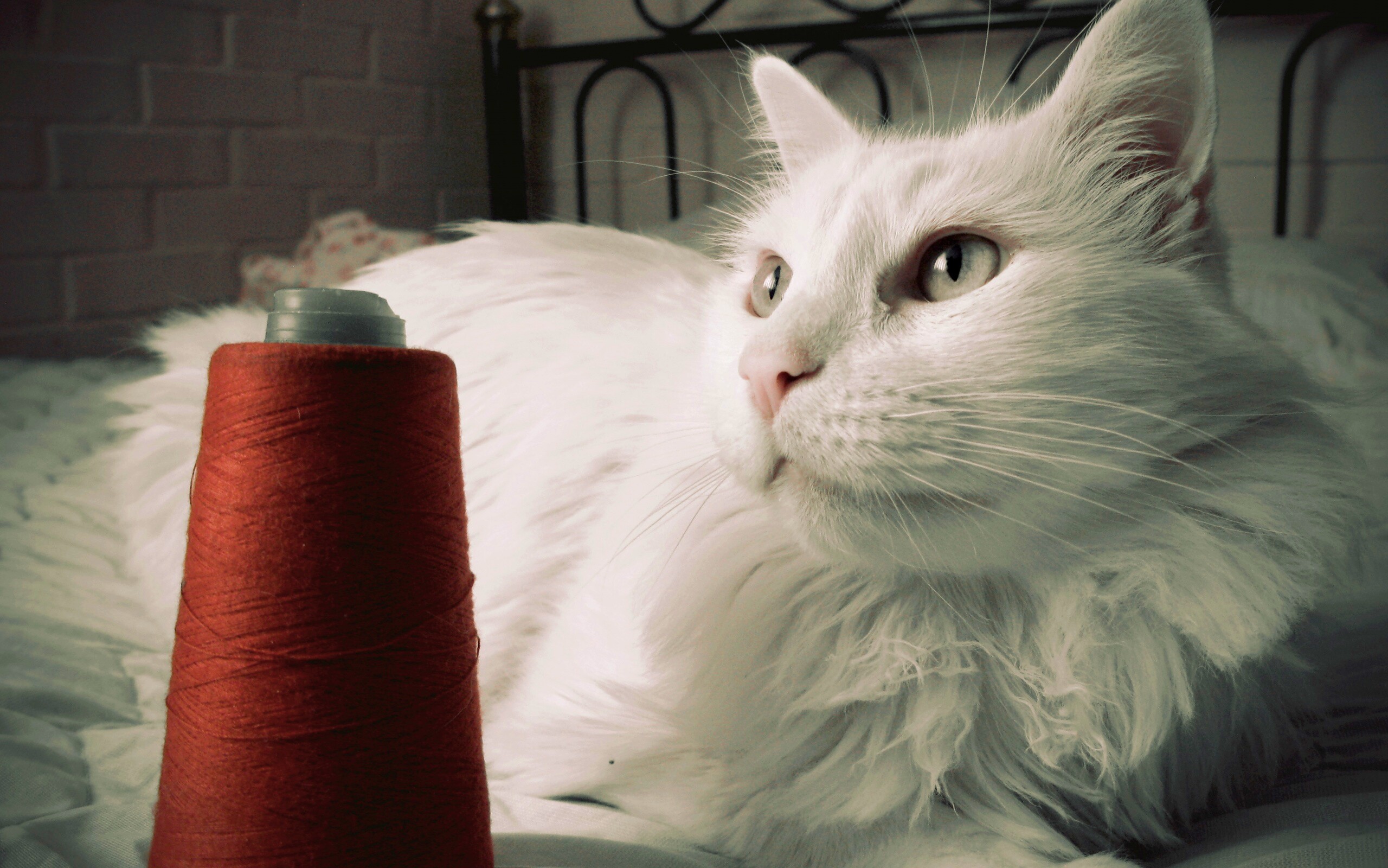Обои для рабочего стола «Белый кот с катушкой ниток» 2560х1600 с фильтром vibrance (оригинал 3648х2736)