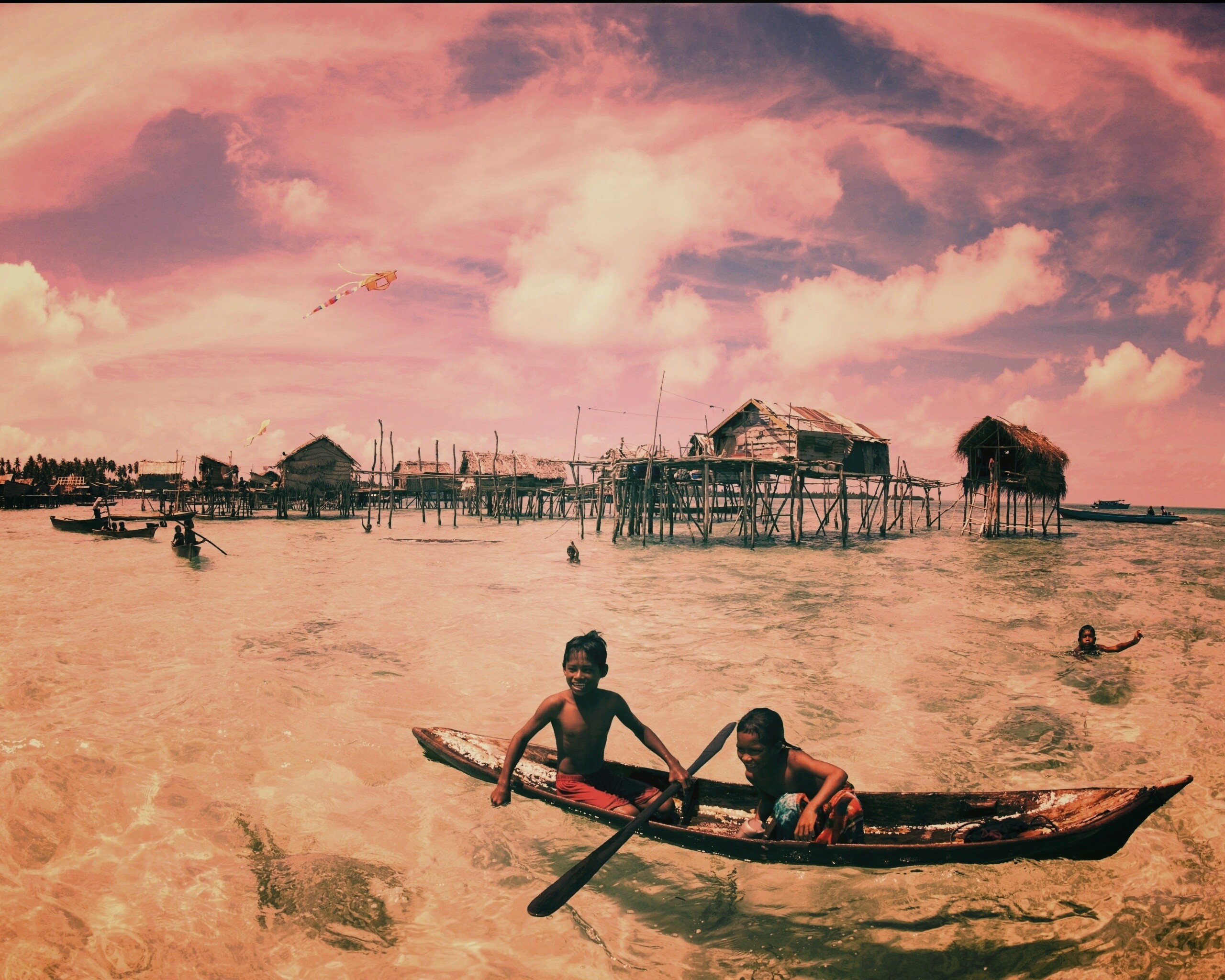 «Дети в лодке у поселения туземцев»