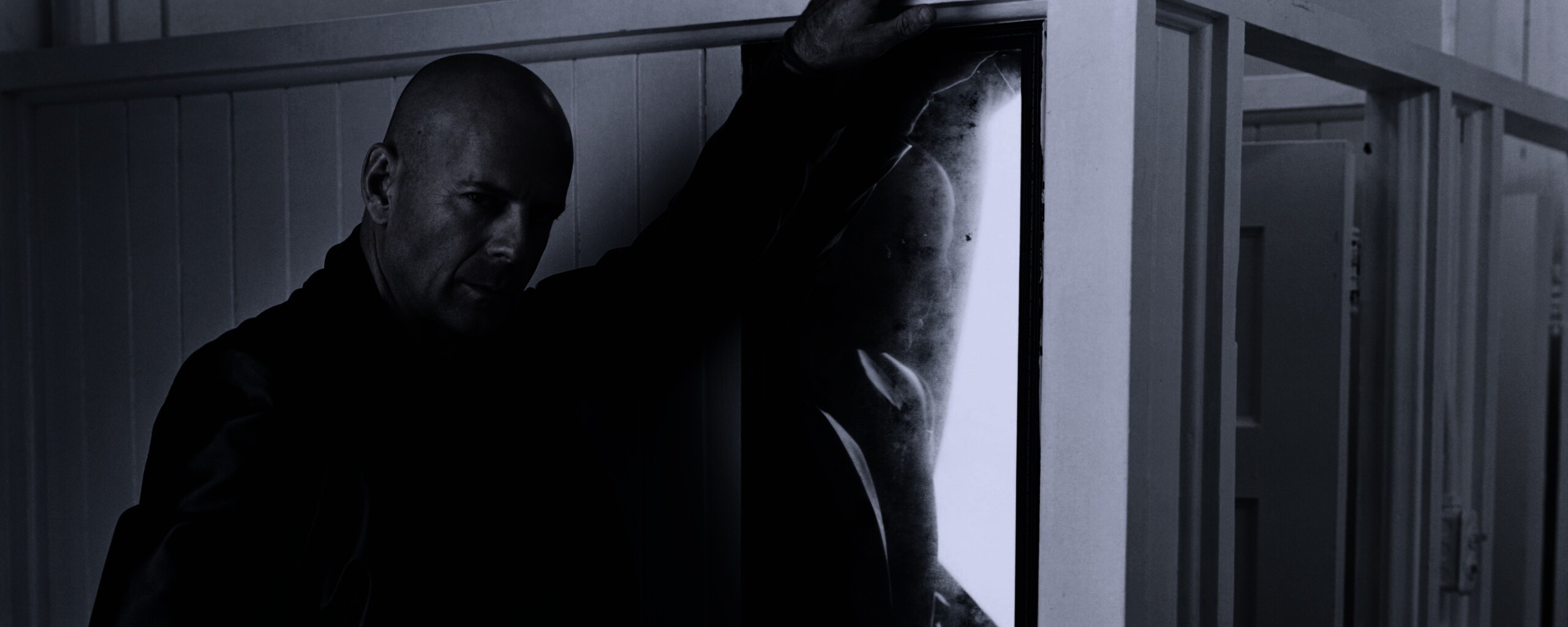 Обои для рабочего стола «Брюс Уиллис у зеркала» 2560х1024 с фильтром gotham (оригинал 4069х3249)