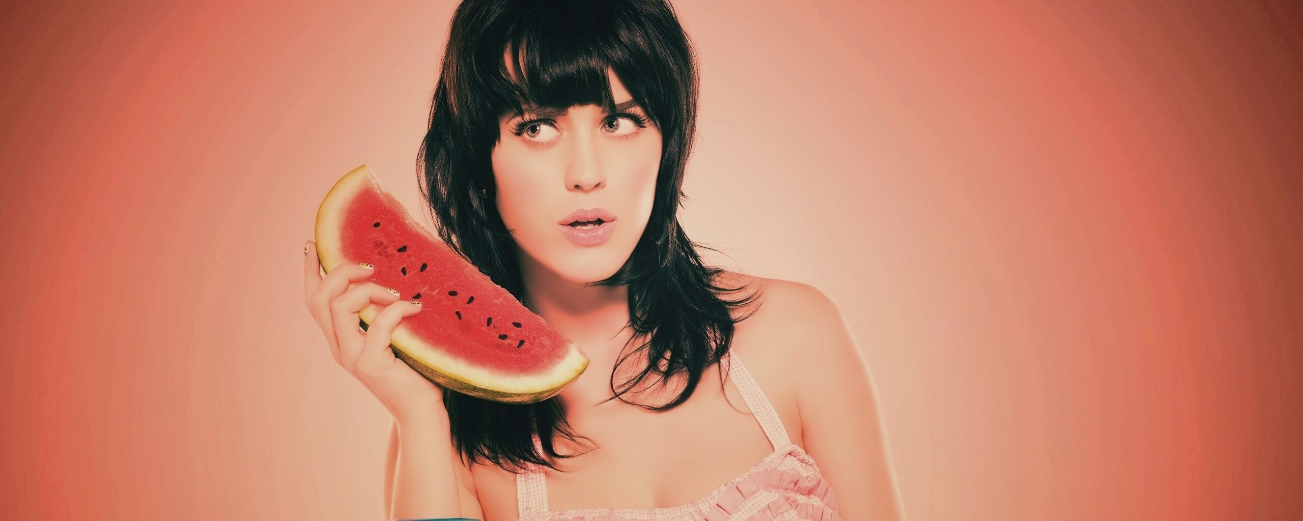 Обои для рабочего стола «Кэти Пэри и арбуз» 2560х1024 с фильтром earlybird (оригинал 2560х1600)
