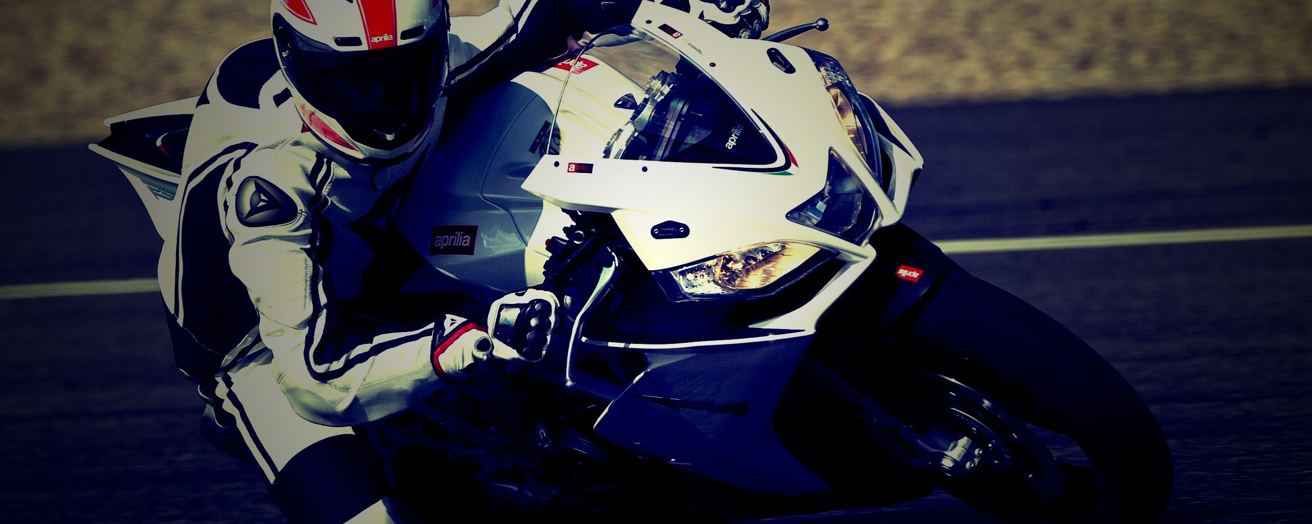 «Байкер в белой экиперовкена Априлия РСВ4»