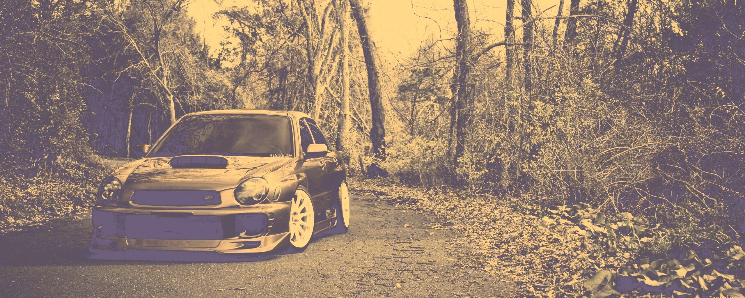 Обои для рабочего стола «Субару Импреза на лесной дороге» 2560х1024 с фильтром nashville (оригинал 2560х1600)
