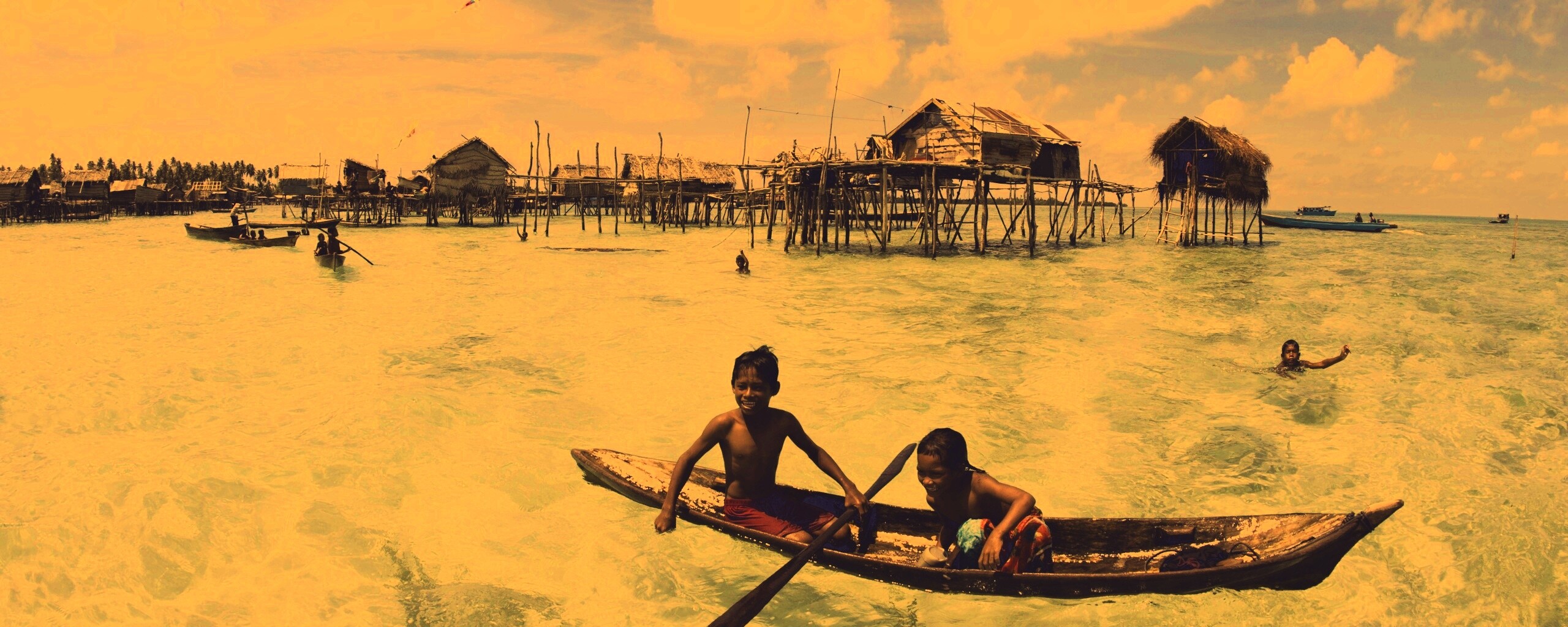 «Дети в лодке у поселения туземцев»
