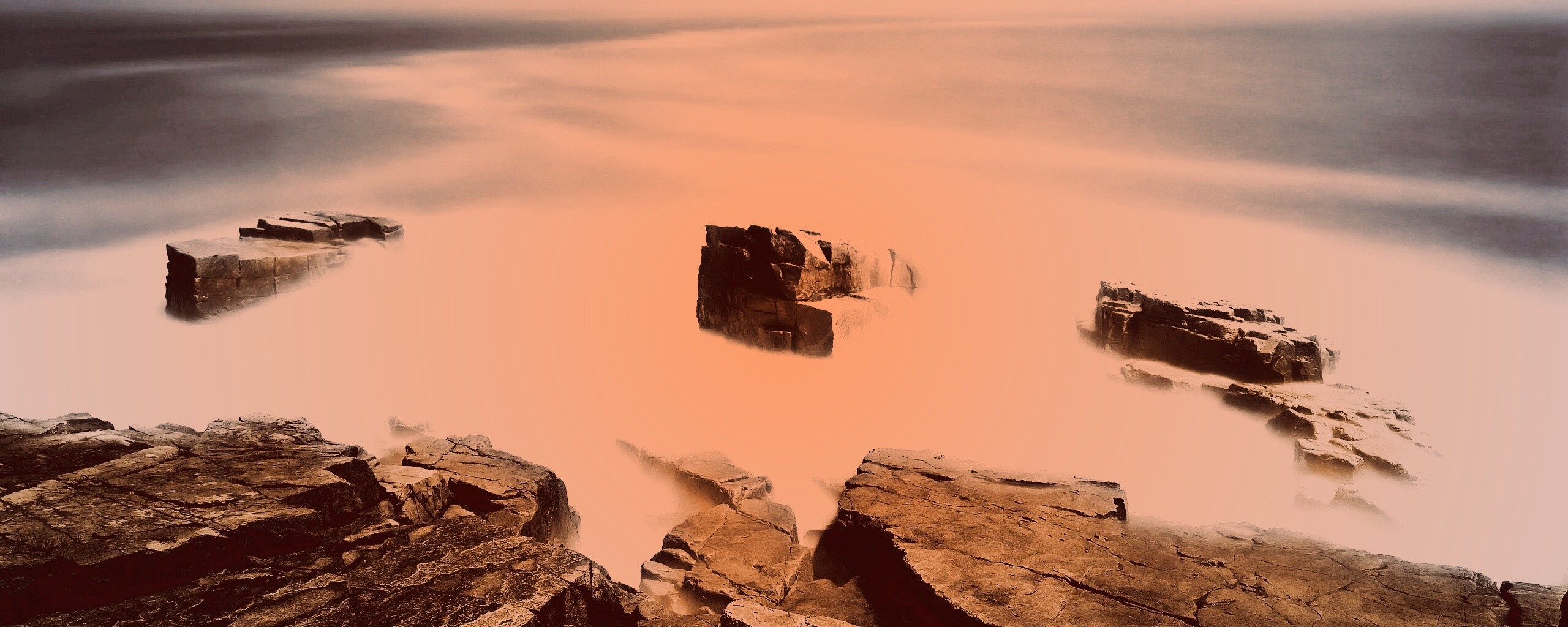 Обои для рабочего стола «Скалы у моря» 2560х1024 с фильтром toaster (оригинал 2560х1600)