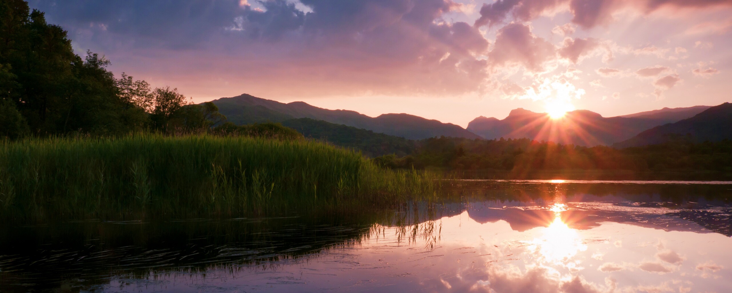 Обои для рабочего стола «Закат за лесом» 2560х1024 с фильтром vibrance (оригинал 4216х2372)